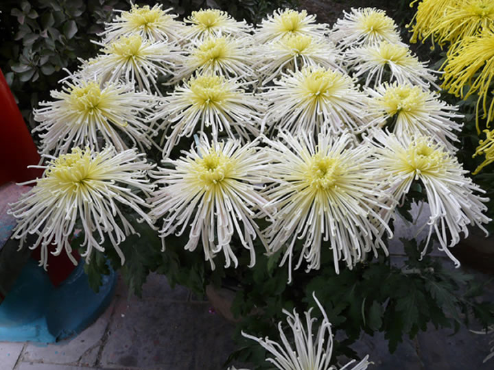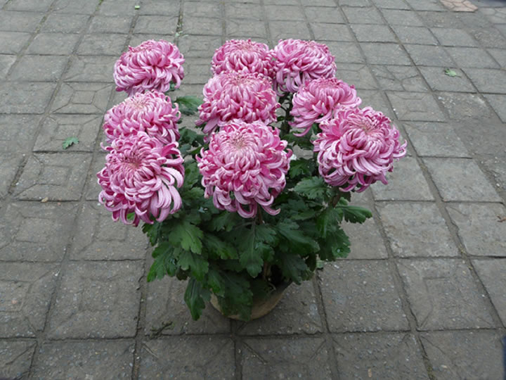 8、栽培管理:嫁接多本菊的前期由地下蒿根供给养分,一般不浇或少浇水。立秋后随着菊花生长的逐渐旺盛,在蒿根周围浇施腐熟的稀薄肥水,并结合根外追肥,用0.1%尿素与0.2%磷酸二氢钾混合液叶面喷施2~3次,浇施肥水的浓度,要逐渐加大,次数也要逐渐增加,开始半月一次,以后每周可追肥2~3次,套盆内浇水要见干见湿,每次浇透为止,花蕾透色后继续追肥,直至花轮放开为止。